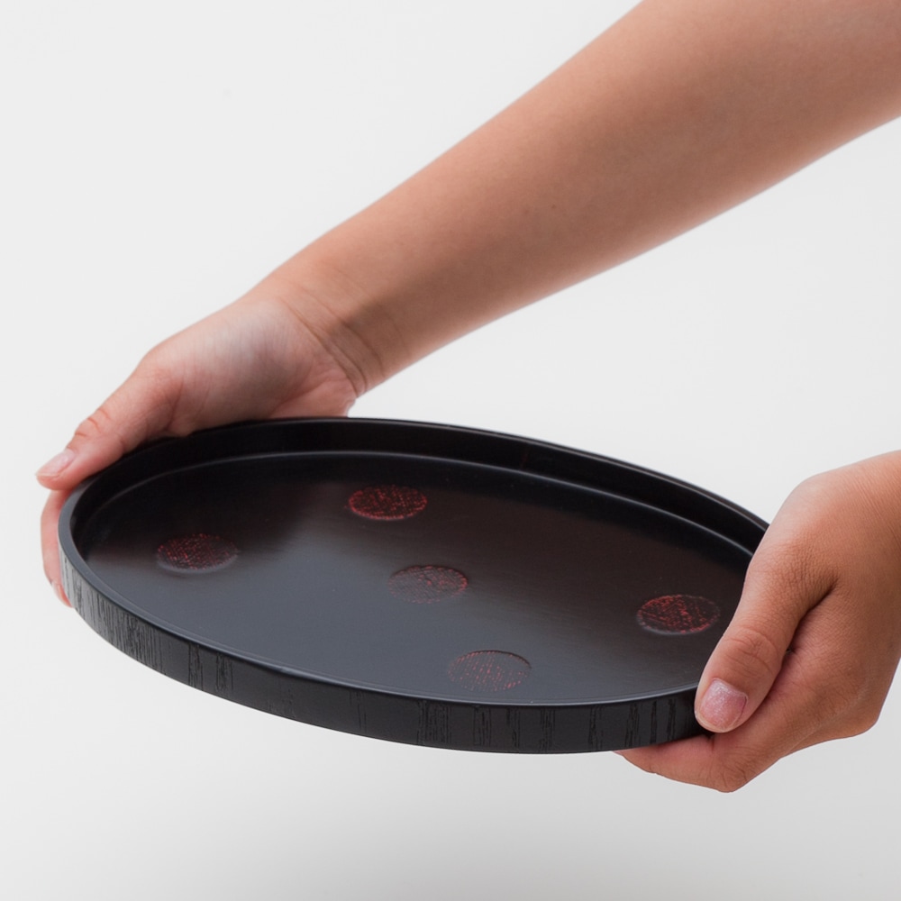 天然木製 8寸 小判盆 水玉 曙 漆塗り 24cm