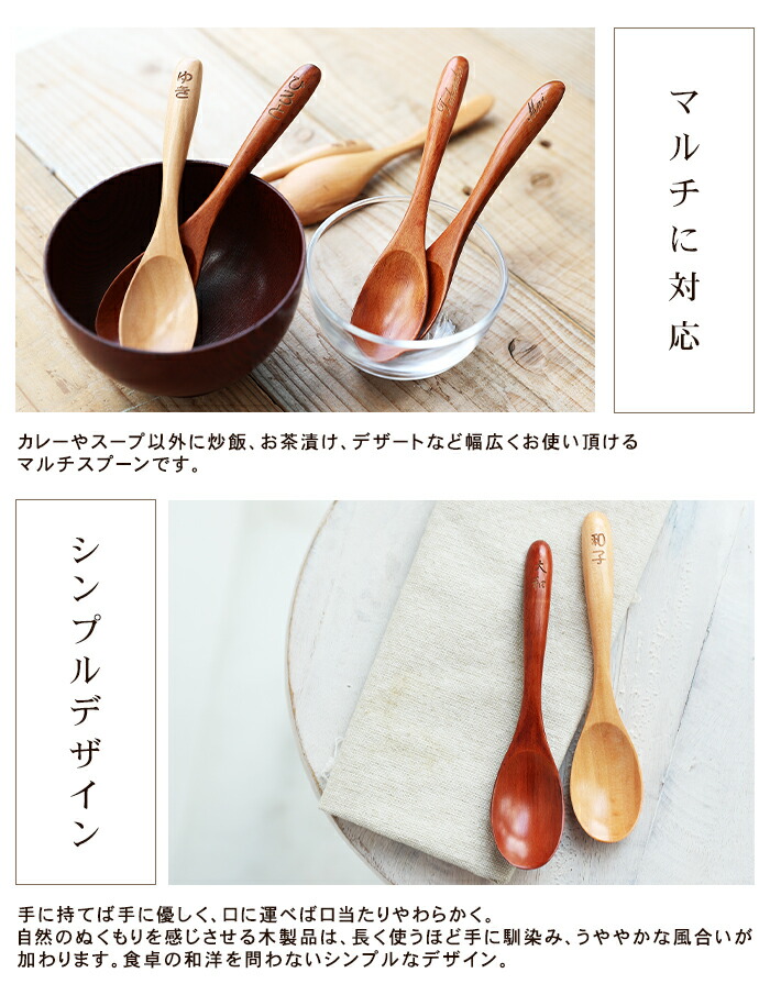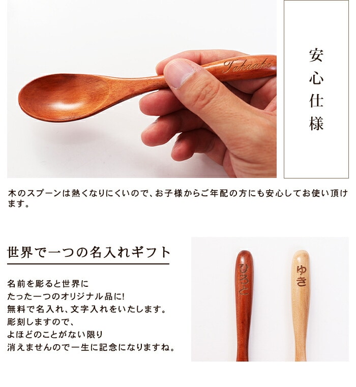 名入れスプーンの決定版!お名前を彫って世界に一つだけのMyスプーン! 口当たりがとっても優しい木のスプーン。 一度、木のスプーンを使うとその滑らかな口当たりの虜になります。 木製は金属の嫌な味がしませんので、料理そのものの味をお楽しみ頂けます。 カレーやスープ以外に炒飯、お茶漬け、デザートなど幅広くお使い頂けるマルチスプーンです。 手に持てば手に優しく、口に運べば口当たりやわらかく。 自然のぬくもりを感じさせる木製品は、長く使うほど手に馴染み、うややかな風合いが加わります。 食卓の和洋を問わないシンプルなデザイン。 木のスプーンは熱くなりにくいので、お子様からご年配の方にも安心してお使い頂けます。 ギフトボックスに入っていますので、贈り物にも安心です。 結婚祝い、引き出物、母の日、父の日、敬老の日などのプレゼントはもちろんのこと、業務用のノベルティや記念品にも最適です。 当店ではギフト包装無料となっております。 |