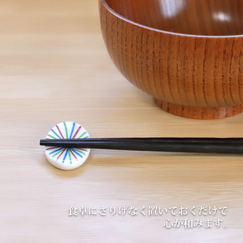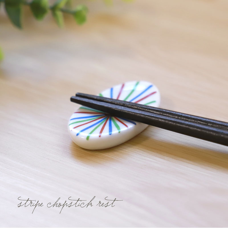 カラフルなストライプ柄がデザインされた陶器の箸置きです。