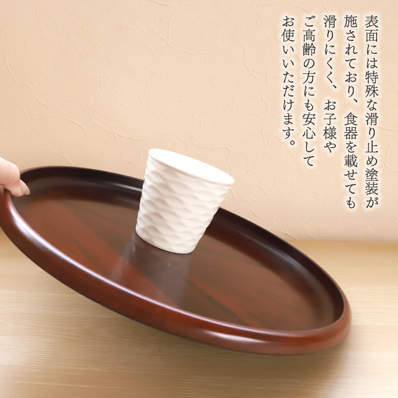 表面には特殊な滑り止め塗装が施されており、食器を載せても滑りにくく、お子様やご高齢の方にも安心してお使いいただけます。