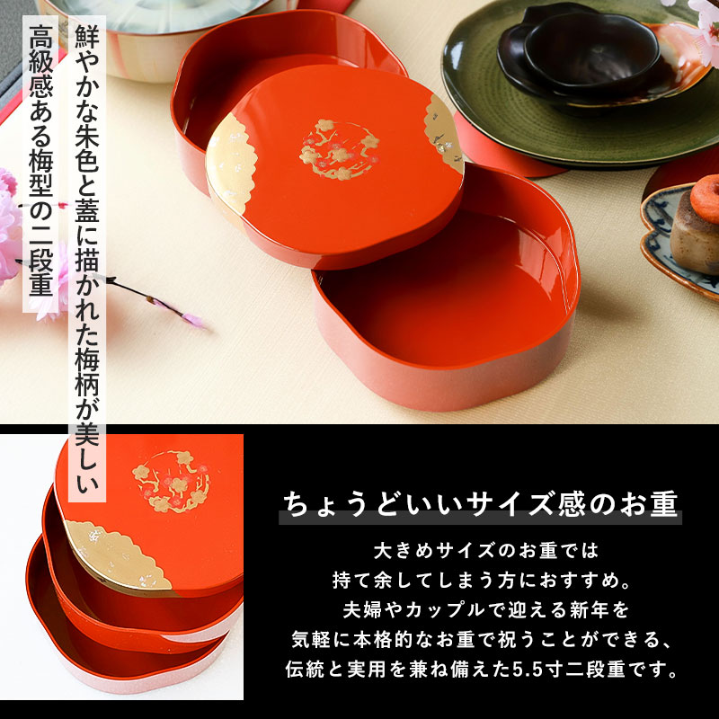 重箱 お重箱 2段 5.5寸 16.5cm お重 日本製 山中塗 山中塗り 梅の華 二人用 三人用 一人用 二段重箱 小さめ 小さ目 小さい ミニ 夫婦 カップル おせち おせち料理 お重箱 金 ゴールド 朱色 梅の花 梅の花 梅柄 梅 うめ ウメ 花柄 おしゃれ お重 お節 お正月 運動会 お花見 行楽 オードブル 和風 シンプル 二段 2人 3人 1人 家族 漆器 送料無料 ランチボックス アウトドア キャンプ ピクニック おもてなし 年末年始 お正月 パーティー 和食 洋食 和洋折衷 伝統工芸 結婚祝い お祝い 御祝 内祝 内祝い 父の日 母の日 敬老の日 お祝い返し ウェディングギフト ブライダルギフト バレンタインデー ホワイトデー 贈り物 引き出物 引出物 結婚 出産 命名 ギフト セット 詰め合わせ 贈答品 記念日 販促物 ノベルティ 誕生日 クリスマス 新学期 新生活 記念品 卒業記念品 お返し お礼 御礼 ごあいさつ ご挨拶 御挨拶 プレゼント お見舞い お餞別 引越しご挨拶 入園 入学祝い 卒園祝い 卒業祝い 就職祝い 新築祝い 快気祝い 開店祝い 二次会 披露宴 結婚式 出産祝い 初節句 七五三 成人式 昇進祝い 新築 上棟 引っ越し 引越し祝い 開店 退職 快気 全快祝い 初老 還暦 古稀 喜寿 傘寿 米寿 卒寿 白寿 長寿 金婚式 銀婚式 ダイヤモンド婚式 結婚記念日 木婚式 定年 景品 賞品 粗品 法事 忌明け 四十九日 初盆 お中元 御中元 お歳暮 御歳暮 お年賀 御年賀年始挨拶 のし メッセージカード ラッピング キッチン雑貨 食器 ミタニ みよし漆器本舗 みよし漆器 三好漆器 ポイント消化