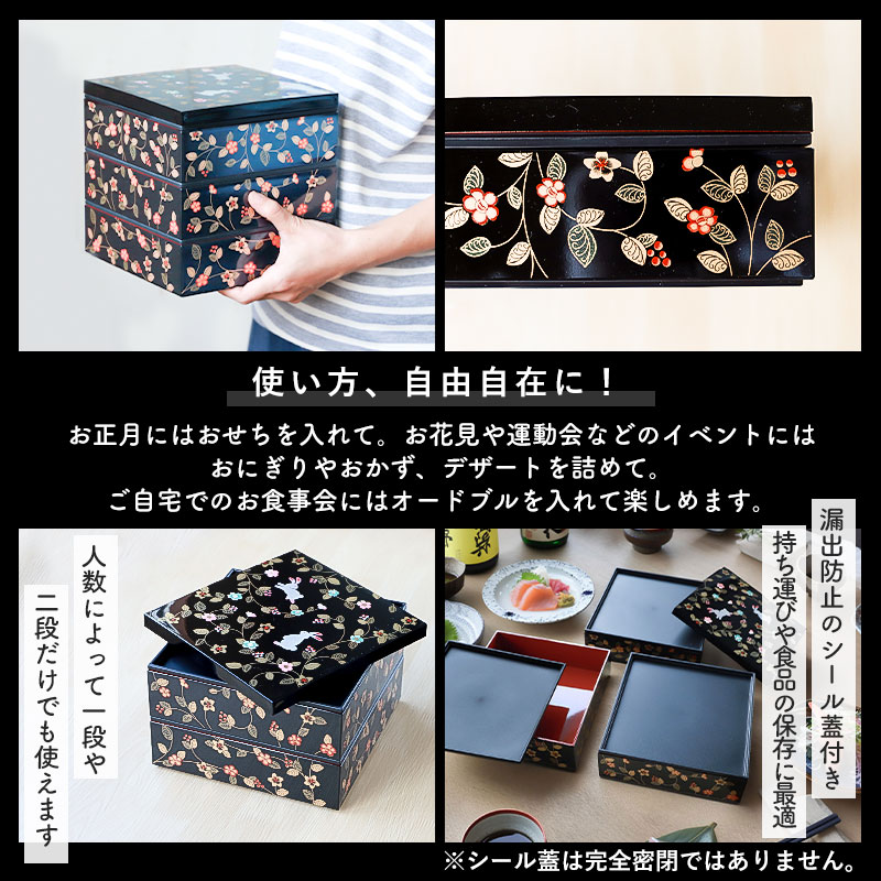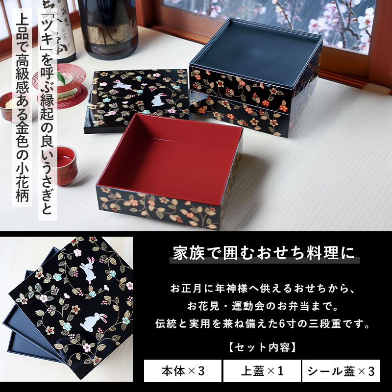 重箱 3段 6寸 18cm 黒 朱 お重 日本製 山中塗 山中塗り 国産 シール蓋付き 花の小路 三人用 四人用 三段重箱 おせち おせち料理 お重箱 おしゃれ お節 お正月 運動会 お花見 行楽 シンプル 内朱 三段 3人 4人 家族 漆器 仕切り無し うさぎ ウサギ 兎 ラビット 花柄 花 フラワー 果実 送料無料 黒色 ブラック 朱色 レッド 金色 ゴールド シールフタ 蓋 フタ 蓋付き フタ付き 保存容器 かわいい ランチボックス アウトドア キャンプ ピクニック おもてなし パーティー 和食 洋食 和洋折衷 伝統工芸 結婚祝い お祝い 御祝 内祝 内祝い 父の日 母の日 敬老の日 お祝い返し ウェディングギフト ブライダルギフト バレンタインデー ホワイトデー 贈り物 引き出物 引出物 結婚 出産 命名 ギフト セット 詰め合わせ 贈答品 記念日 販促物 ノベルティ 誕生日 クリスマス 新学期 新生活 記念品 卒業記念品 お返し お礼 御礼 ごあいさつ ご挨拶 御挨拶 プレゼント お見舞い お餞別 引越しご挨拶 入園 入学祝い 卒園祝い 卒業祝い 就職祝い 新築祝い 引越し祝い 快気祝い 開店祝い 二次会 披露宴 結婚式 出産祝い 初節句 七五三 成人式 昇進祝い 新築 上棟 引っ越し 開店 退職 快気 全快祝い 初老 還暦 古稀 喜寿 傘寿 米寿 卒寿 白寿 長寿 金婚式 銀婚式 ダイヤモンド婚式 結婚記念日 木婚式 定年 景品 賞品 粗品 法事 忌明け 四十九日 初盆 お中元 御中元 お歳暮 御歳暮 お年賀 御年賀年始挨拶 のし メッセージカード ラッピング キッチン雑貨 食器 みよし漆器本舗 みよし漆器 三好漆器 ポイント消化